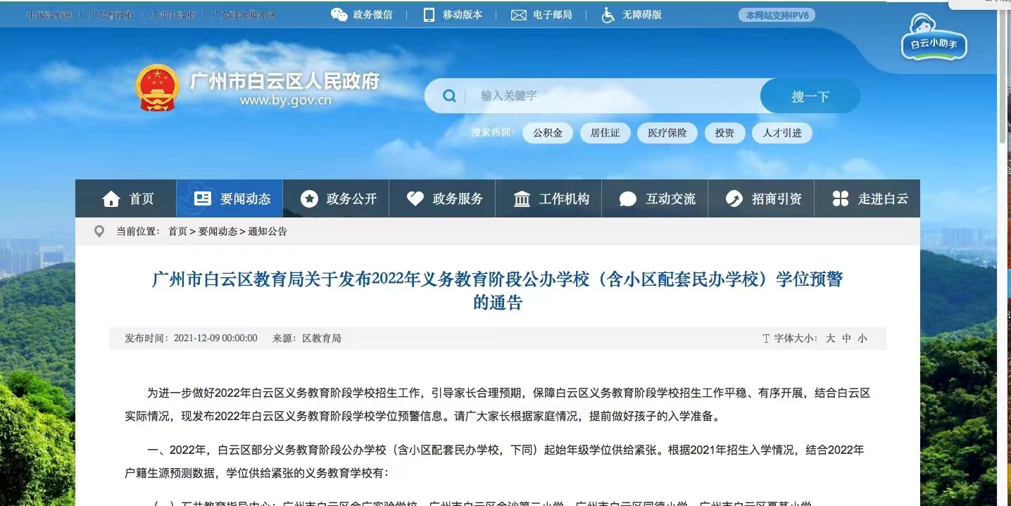 12月9日,广州市白云区教育局发布2022年义务教育阶段公办学校(含小区配套民办学校)学位预警的通告,石井街、新市街、永平街以及白云区北部四镇均有学校出现学位供给紧张。