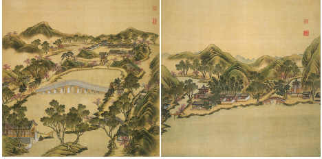 [清],《西湖四十景》,从左往右,依次描绘的景致为曲院风荷、平湖秋月、杏花春馆、蓬莱瑶台。(视觉中国提供)