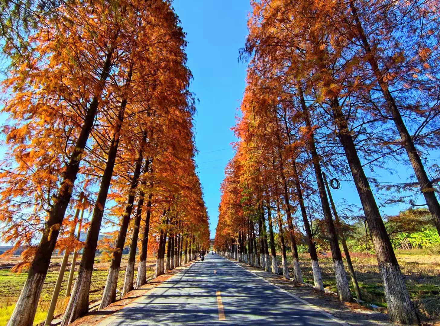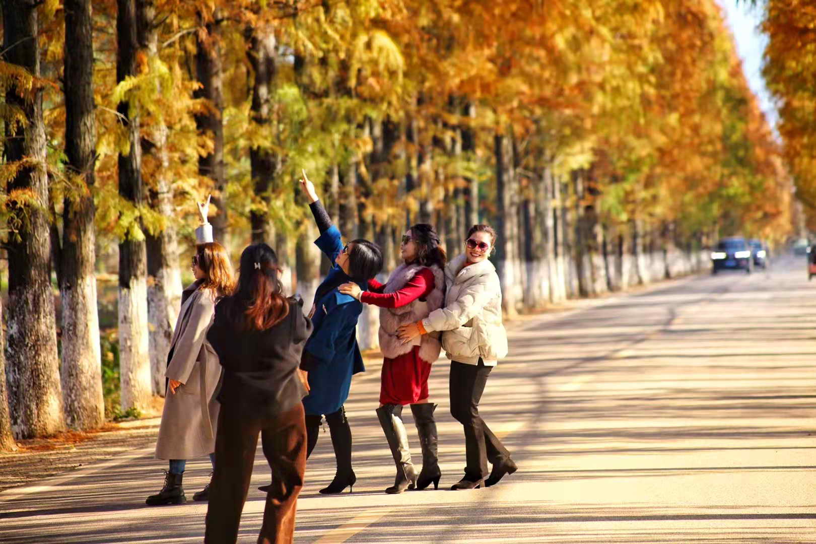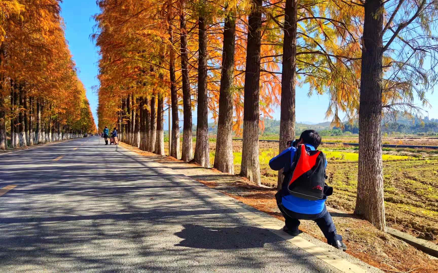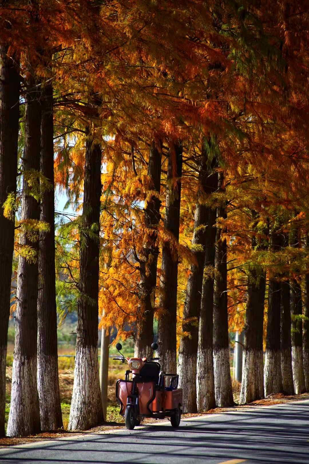 染红的水杉换上了新衣,高大的水杉英气十足,伫立在这乡村大地间。醉美乡村公路吸引了众多摄影爱好者来此拍摄,留下这冬日时光的片片剪影。冬日的暖阳,嬉闹的游客,整齐的红杉,笔直的公路,缓行的汽车,构成了这一幅幅美丽的乡村图景。