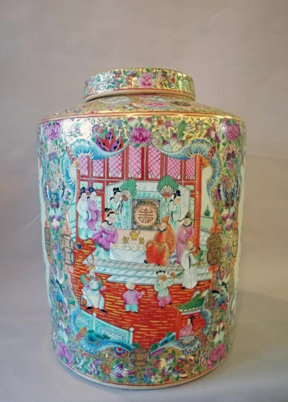 (李溢坡作品 《八宝蝠鼠吊金钱郭子仪贺寿》平顶茶叶罐 图源:光艺广彩手绘瓷公众号)