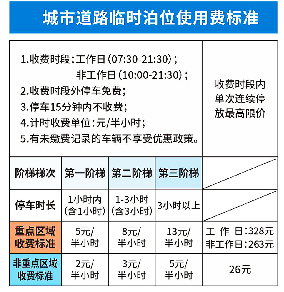 据介绍,为提高城市道路临时泊位的使用周转率,城市道路临时泊位改造完成后将实行“先停车、后付费”管理模式,并按广州市中心六区城市道路临时泊位使用费收费标准(累进式加价的阶梯式收费标准,详见附表)实施收费管理。市民可通过“广州泊车”微信公众号、小程序或支付宝生活号线上支付泊位使用费,也可前往市道路事务中心公布的业务网点缴纳泊位使用费。完成缴费后即可申领电子发票。市道路事务中心派驻现场的泊位巡查人员不收取任何费用。