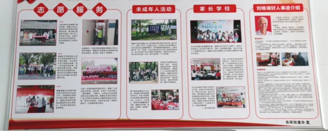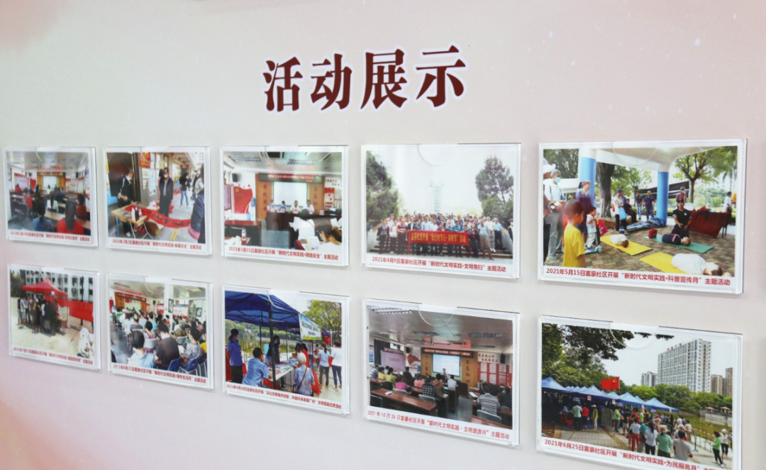 近日,记者来到了东环街富豪社区新时代文明实践站。实践站门外,挂有该站各活动场室的指引牌,推门而入,右侧是一面6米长的宣传栏,墙上展示了富豪社区2021年开展文明实践主题活动的成果和计划。