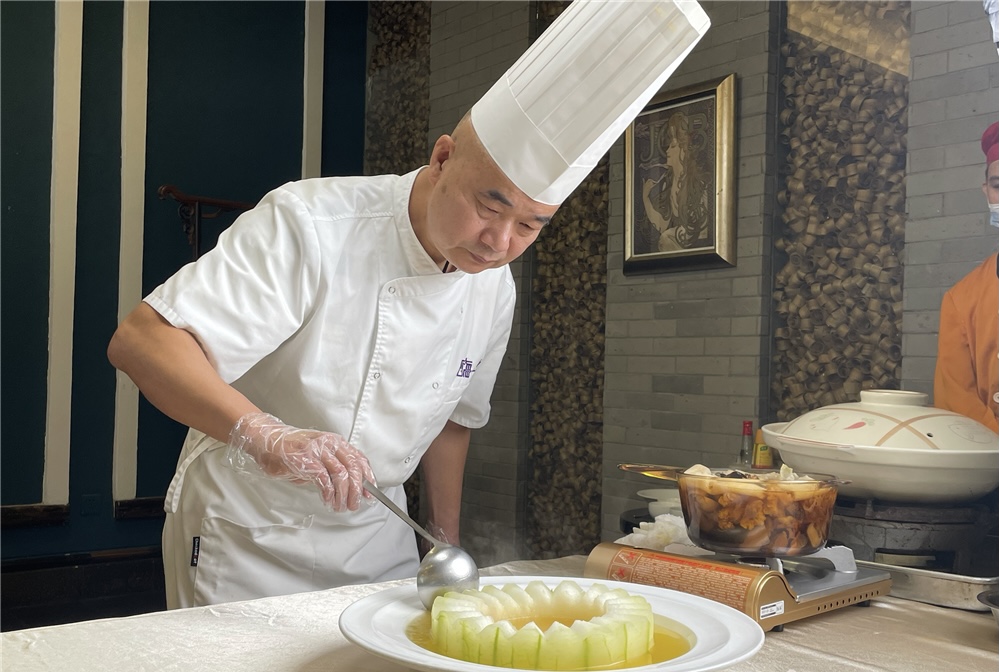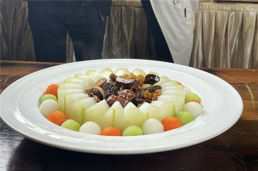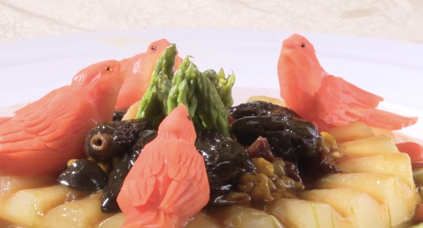 因此,在此次展示过程中,刘冠铭便以羊肚菌、北菇、草菇、云耳、黄耳、竹笙等菌菇入馔,放入去皮扣软的冬瓜环内,并以青、红、白三种萝卜雕刻成小鸟和龙珠,隔水蒸软后分别摆放在冬瓜环周边,最后用芦笋尖调和芡汁淋上,烹制出色香味俱全、素却不寡淡的“冬林上素”。