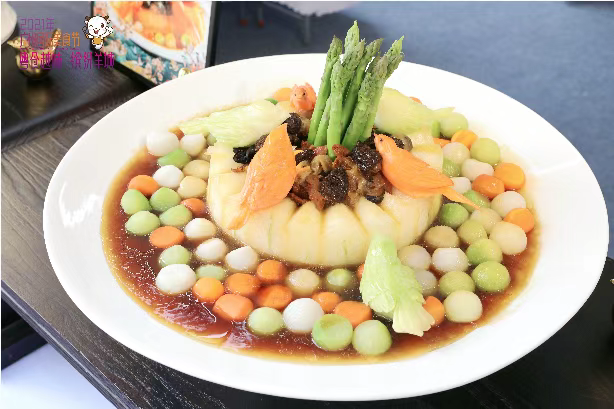 该菜式精选大自然的馈赠—菌菇,代表祖国的山河大地,又以粤菜特色—食雕(胡萝卜雕刻成小鸟)组合而成。常人道吃素要看缘分,“冬林上素”是由“三菇六耳九笋”组成。但由于食材受季节变化影响,经常需要根据时令变化进行组合。