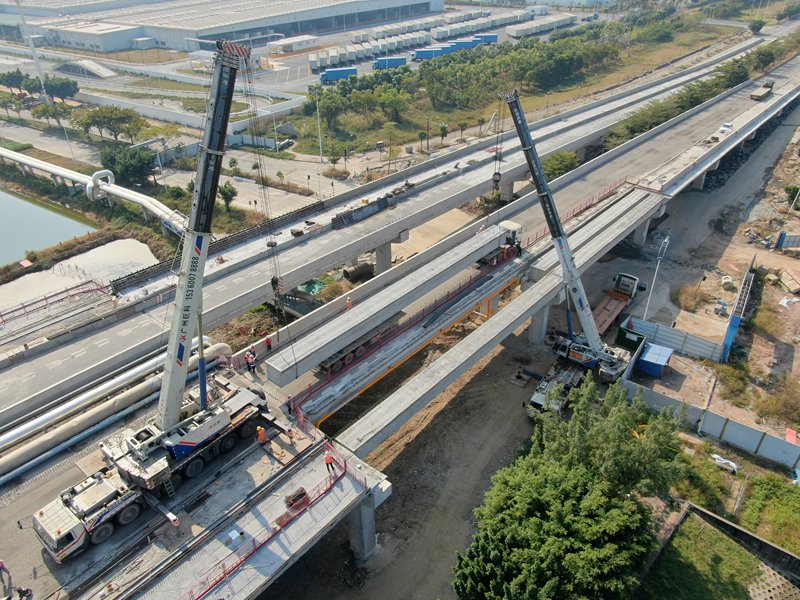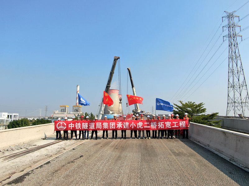 中铁隧道局承担广丰汽车城小虎二桥拓宽工程的全部梁预制和架设,特别是2次涉海、2次紧邻110KV高压线施工。全桥既有强电、弱电、高压蒸汽管、燃气、自来水管线迁改难度大、用地指标受限,安全卡控和施工难点多。建设者提前做好疫情防控工作,同时与区交警大队、建设局、应急管理局、小虎化工管理中心、黄阁镇和周边厂区联系协调,从2020年10月开始对全桥封闭施工。建设者一手抓防疫,一手抓赶工,按照决战决胜四季度目标最终完成了广丰汽车城小虎二桥拓宽架梁任务,也为即将开始的沥青摊铺、路灯安装等工作创造了条件。