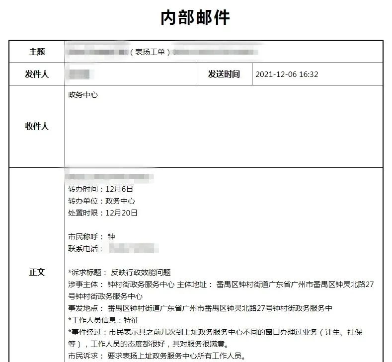 记者从番禺区钟村街获悉,12月6日,钟村街政务服务中心收到一份特殊的12345热线办理工单。