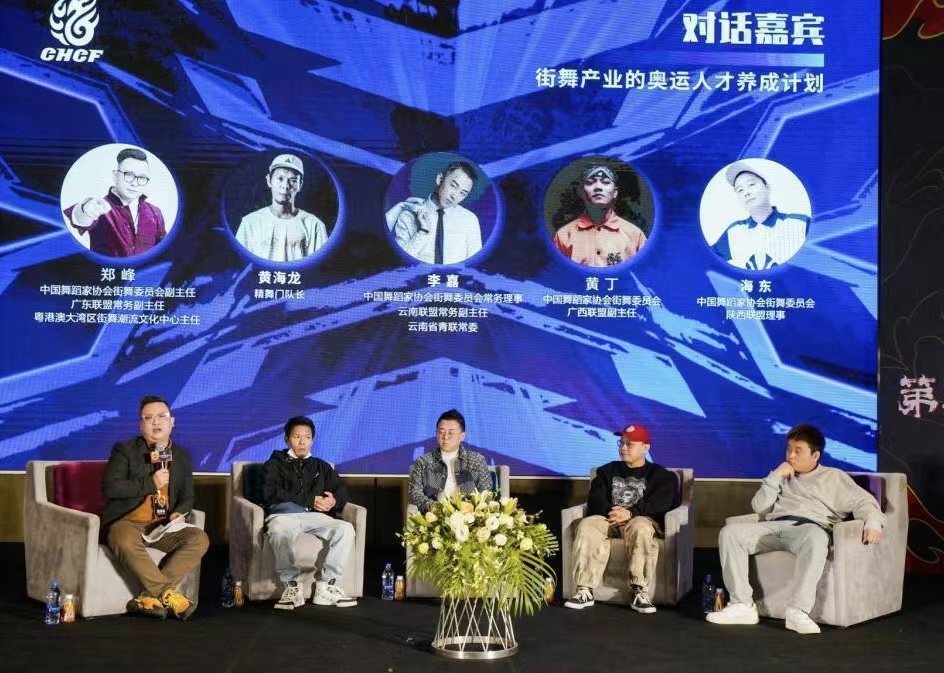“对话嘉宾”作为本次论坛的焦点环节,针对“ 街舞的体育竞技与舞蹈艺术的双重发展”议题进行讨论。中国舞蹈家协会街舞委员会副主任郑峰、中国舞蹈家协会街舞委员会常务理事李嘉、精舞门队长黄海龙、中国舞蹈家协会街舞委员会广西联盟副主任黄丁、中国舞蹈家协会街舞委员会陕西联盟理事海东参与了话题讨论。
