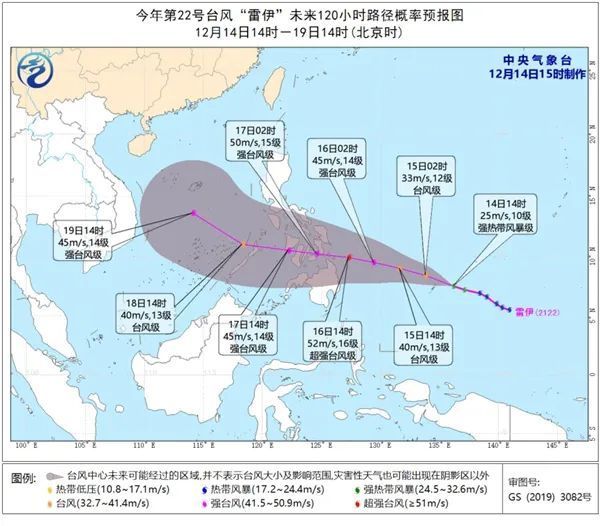 昨天14时,今年第22号台风“雷伊”在西北太平洋洋面生成。今天上午,“雷伊”加强为强热带风暴级。中央气象台预计,“雷伊”将以每小时20公里左右的速度向西偏北方向移动,强度继续增强,最强可达强台风级或超强台风级(14-16级,45-52米/秒),并逐渐向菲律宾棉兰老岛北部一带沿海靠近,17日穿过菲律宾群岛南部后,将于18日中午前后移入南海东南部海面。