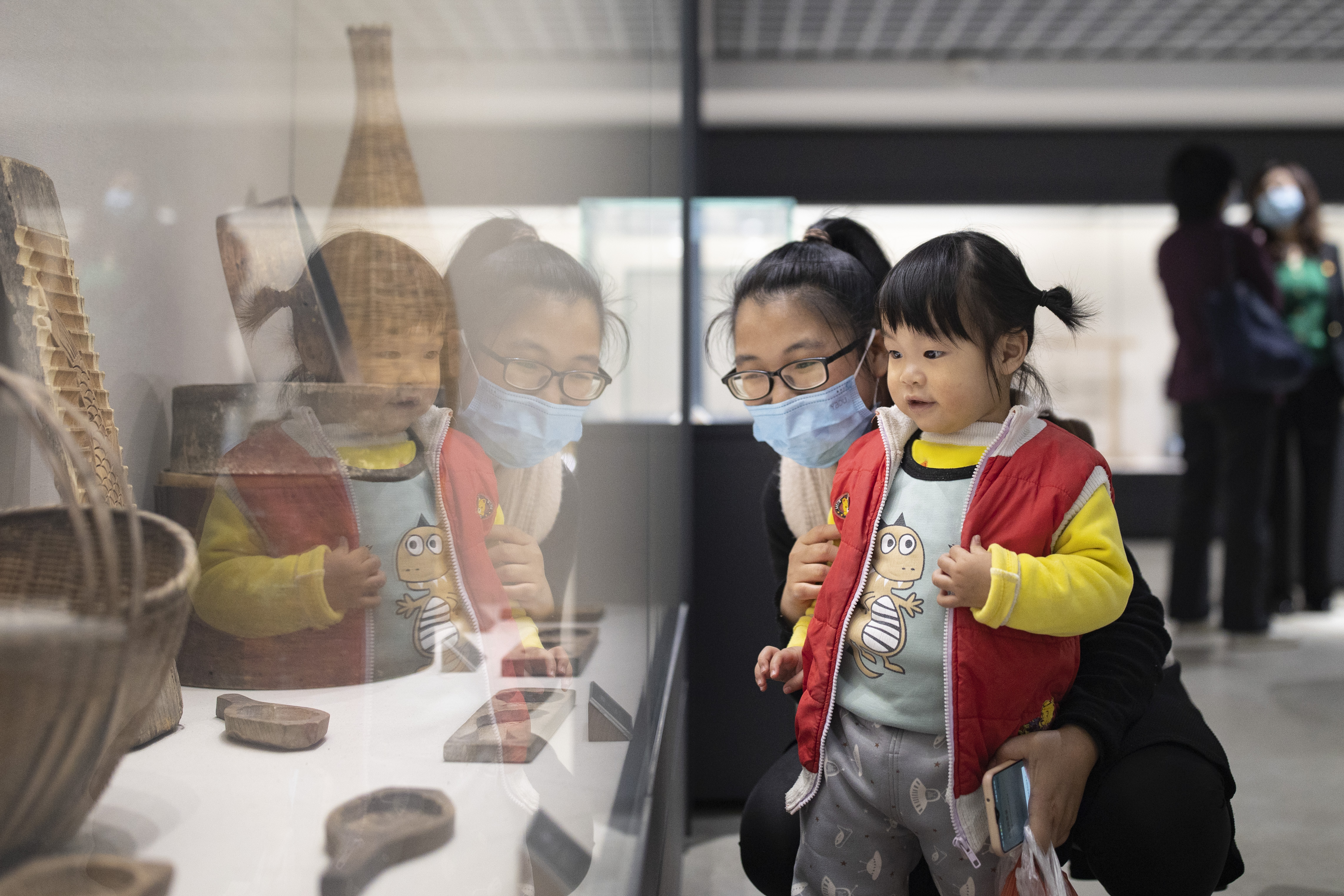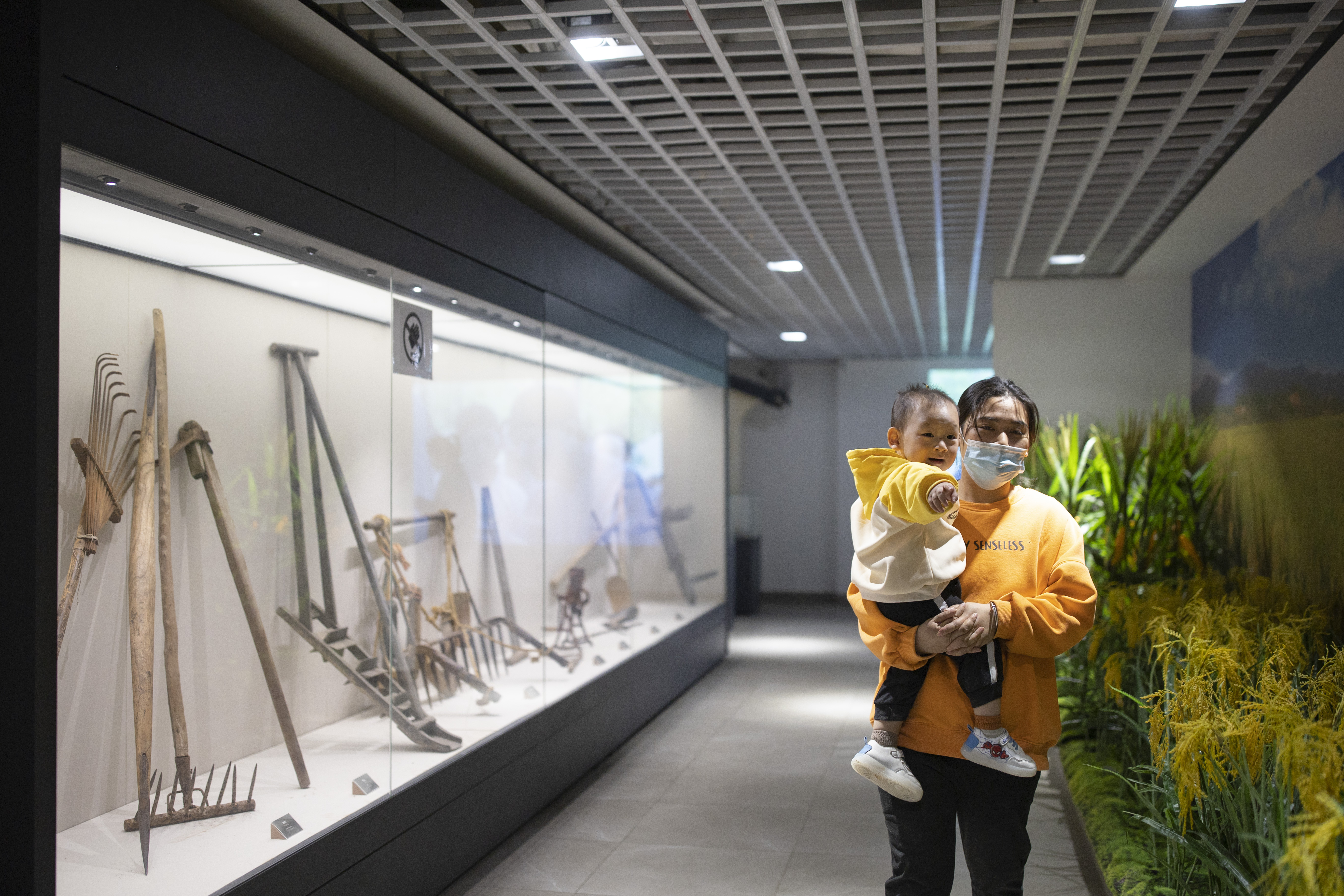 年轻的父母们,买菜之余把展览馆当成了遛娃好去处。展馆内牛娃放牛的雕塑,人工稻田、玉米田的小景都深得小孩子喜爱。尽管女儿愿愿只有2岁多,苏慧慧着带她参观,从头到尾认真讲解。