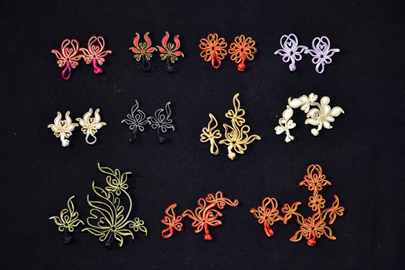 盘扣是一件旗袍必不可少的部件。手工盘扣会在盘花扣的棉线中再嵌进一根铜丝,使棉线更挺括,制成的花纽也更饱满。比较考究的盘扣还会根据袍身的刺绣图案、旗袍款式、绲边颜色等来变换花纽的造型。