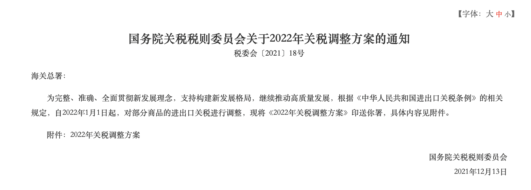12月15日,国务院关税税则委员会发布《2022年关税调整方案》,2022年将调整部分商品的进出口关税。