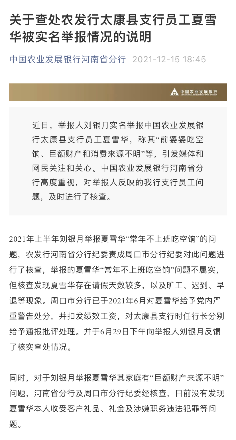 12月15日晚间,中国农业发展银行河南省分行在微信公众号发布通报表示,举报的夏雪华“常年不上班吃空饷”问题不属实,但核查发现夏雪华存在请假天数较多,以及旷工、迟到、早退等现象。周口市分行已于2021年6月对夏雪华给予党内严重警告处分,并扣发绩效工资,对太康县支行时任行长分别给予通报批评处理。并于6月29日下午向举报人刘银月反馈了核实查处情况。