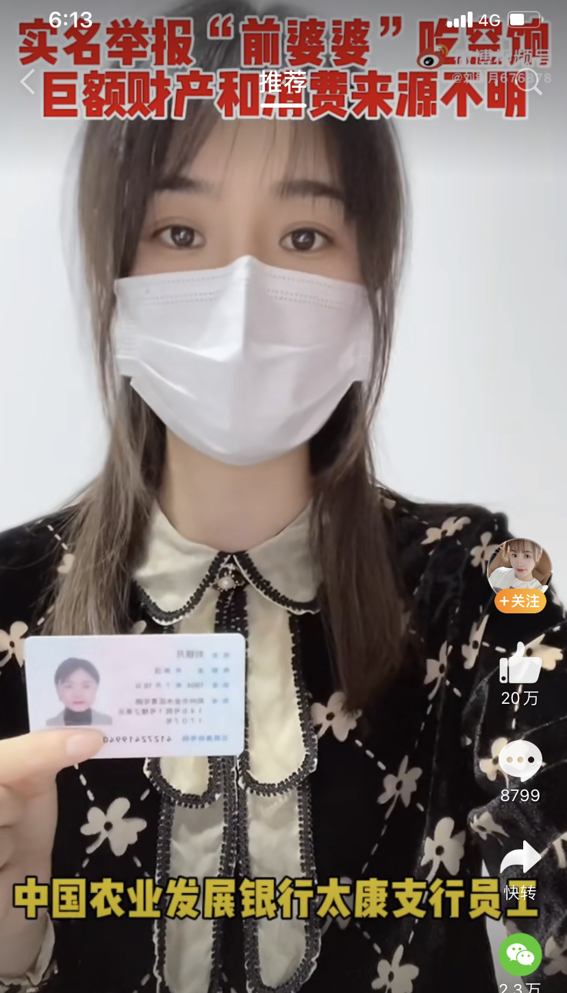 一则关于“前婆婆吃空饷”话题冲上微博热搜。12月16日,记者关注到,有网友近日在微博实名举报前婆婆吃空饷,称前婆婆夏雪华系中国农业发展银行太康支行员工,常年不上班月月领工资,拥有8套房产、9间商铺、4辆汽车,巨额财产来历不明等情况,引发网友关注。