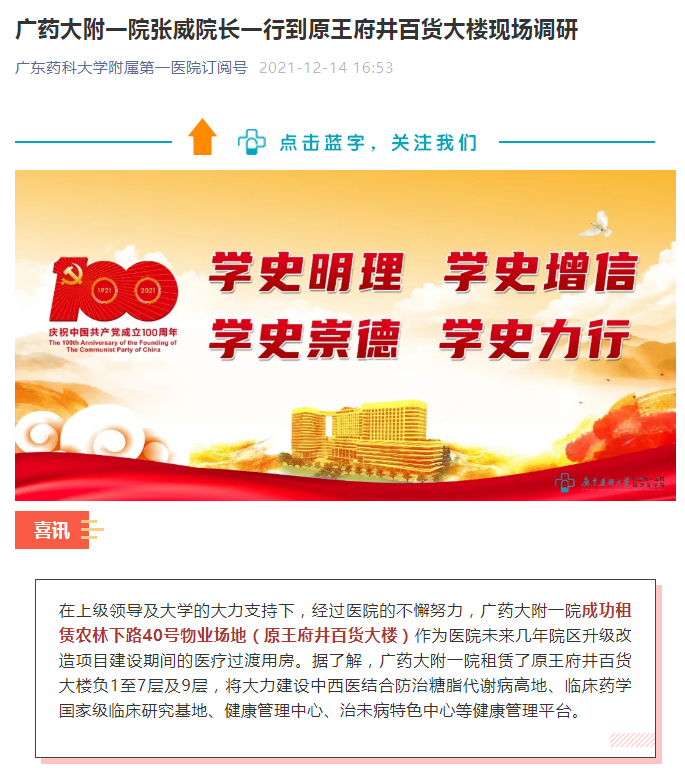 上月底,陪伴广州街坊20多年的王府井百货闭店停业,它所在的大楼将有何新用途?近日,广州日报·新花城记者从广东药科大学附属第一医院(以下简称“广药大附一院”)官微上看到,该院已成功租下原王府井百货所在的大楼负1至7层及9层,作为医院未来几年院区升级改造项目建设期间的医疗过渡用房。