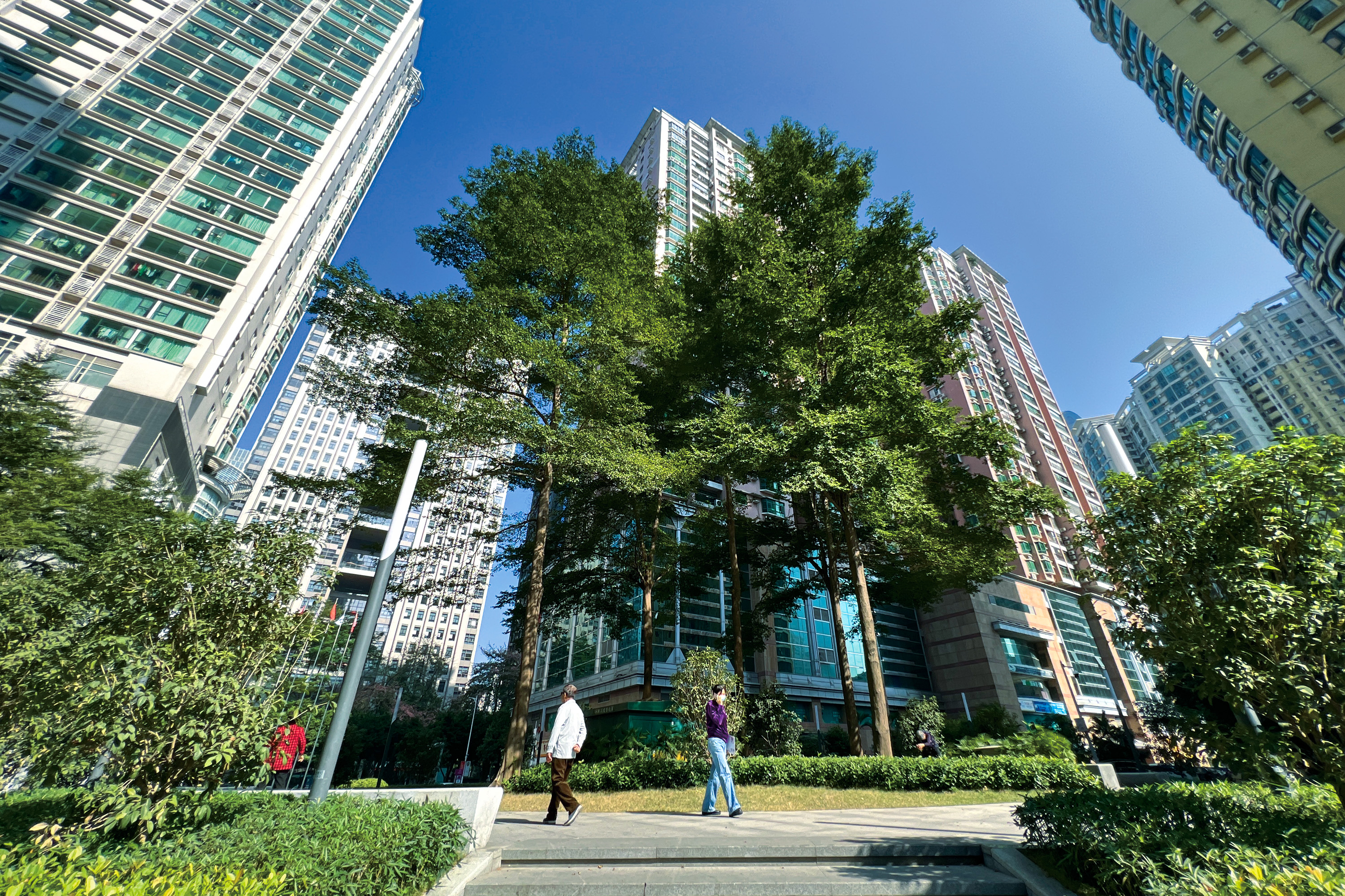在广州市天河区珠江新城华明直街和华明北横街交界的十字路口,五棵细叶榄仁高耸其间,非常显眼。记者一早来到华普绿岛,一班阿姨在绿道中间跳着舞,有说有笑,小孩子在平台空间上玩耍,其乐融融。