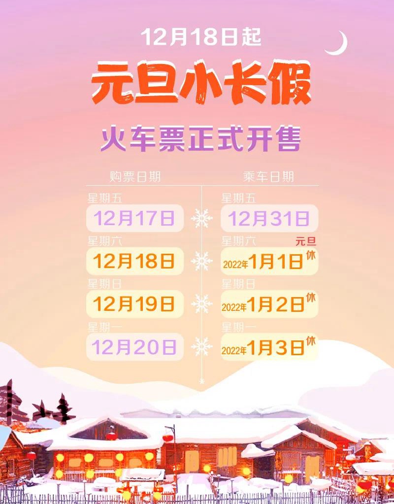 元旦小长假临近,有计划出行的旅客12月18日起可以买票。根据火车票提前15天开售的原则,12月17日可买12月31日车票;12月18日可买2022年1月1日车票;12月19日可买2022年1月2日车票;12月20日可买2022年1月3日车票。