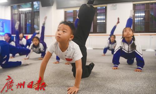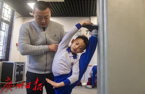 詹天佑小学学生张沥行在老师指导下练习腿功。