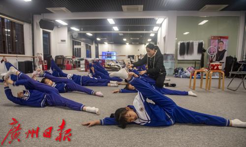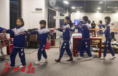 粤剧艺术博物馆少儿粤剧传承基地,学员们在老师的指导下训练粤剧基本功。