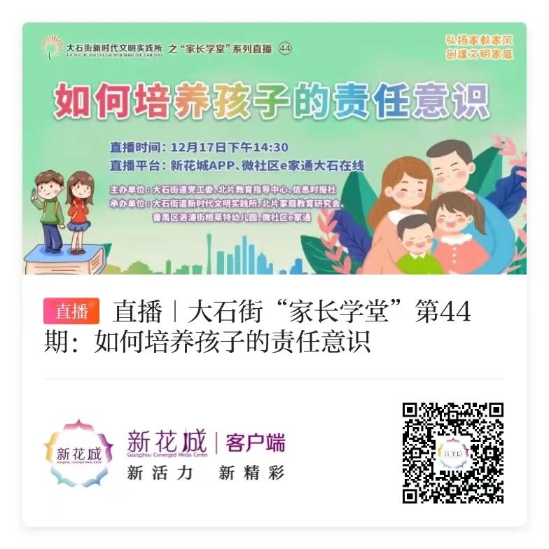 12月17日,番禺区大石街新时代文明实践所之家长学堂第44期邀请多位在教育行业深耕多年的嘉宾来到直播间,与家长、幼儿园教育工作者们一起探讨“如何培养孩子的责任意识”。