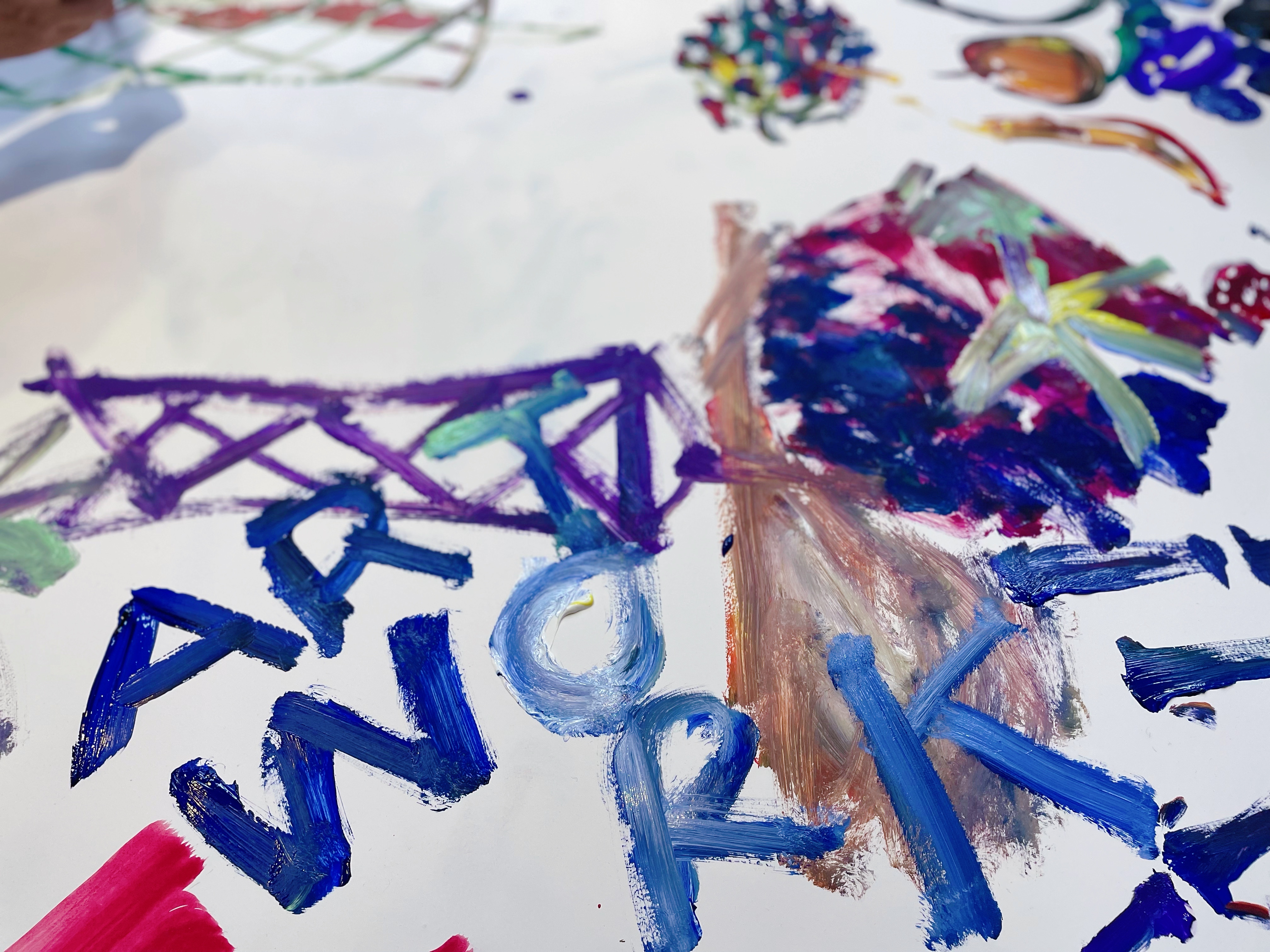 于是,5个绘画小组,各自在大白纸上“认领”了一个“领地”,开始商量绘画大计。有的兴冲冲脱下鞋袜,互相搀扶着站着,用脚趾头夹着画笔开画。瞧,志愿者老师陶陶老师的脚趾头多灵活,简直跟手指一模一样,把大家给逗乐了。