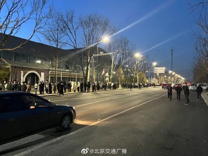 据北京交通广播微博早前的报道,在画室向北大约1.5公里外的徐宋路和双塘街交叉口,是附近居民的核酸检测点。现场检测核酸的人员已经排起数百米的长队,有工作人员提醒大家保持距离戴好口罩。