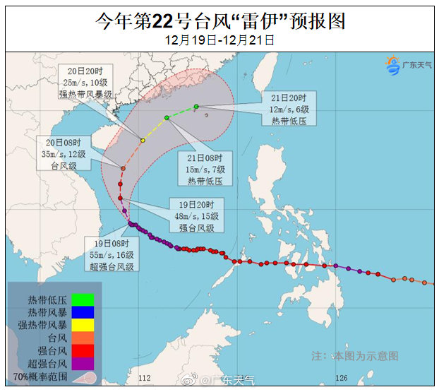 据1951-2020年资料统计,12月登陆广东的台风仅1个,1974年12月2日11时30分,台风IRMA在广东台山以热带风暴级登陆,上岸后很快减弱消亡。台风“雷伊”大概率是在广东外海减弱并消亡,不过19-21日海上有狂风巨浪,船只注意及时回港避风,另外,海钓、冲浪、帆船等滨海活动建议取消,安全第一。