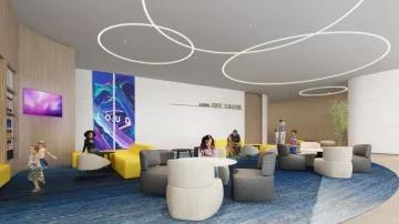 位于三层中庭的中央广场,以木质主题墙及阶梯展台为主体标志,可满足艺术展演、音乐会、展览、演艺秀等不同使用需求。广场右侧设有彩色树叶展廊,是驻足观赏与探索发现的有趣天地。同时,从这一层开始,也是青少年宫培训教室的开始。