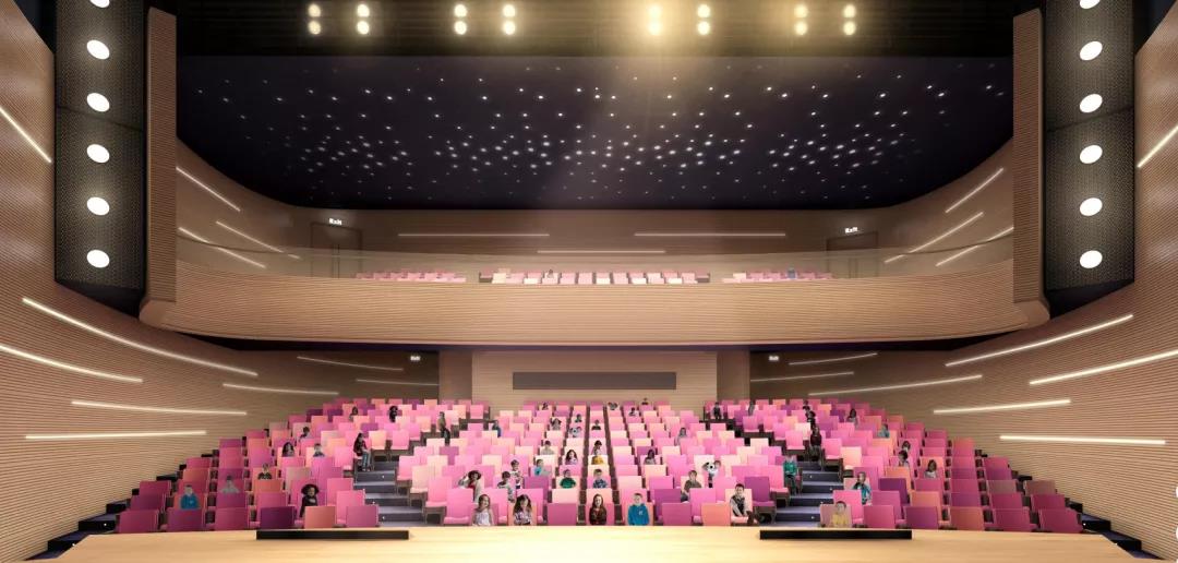 位于一、二层(北面)的剧场,是建筑的点睛之笔,可容纳400人,设有专业的音响设备及建声条件,为举办丰富多彩的演出及文化艺术活动提供了专业性环境,是一座专属花都区青少年的艺术剧场。
