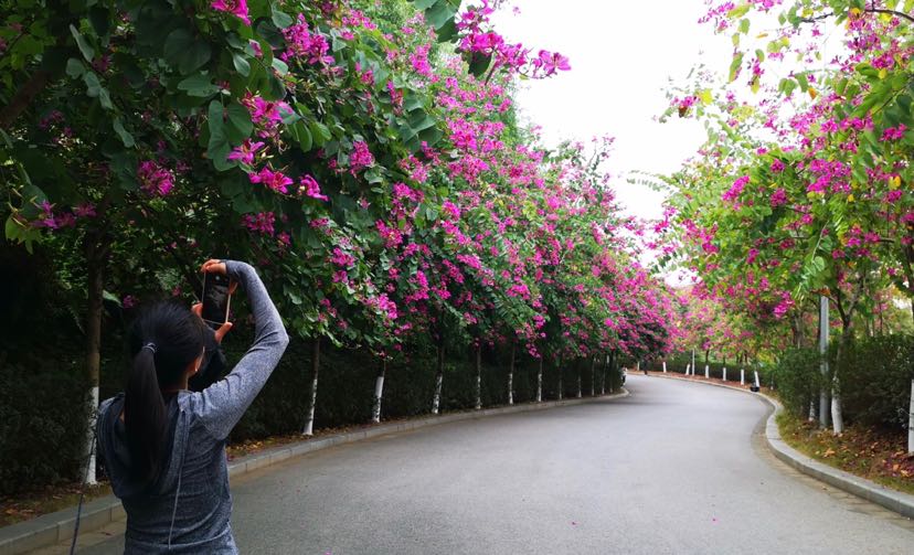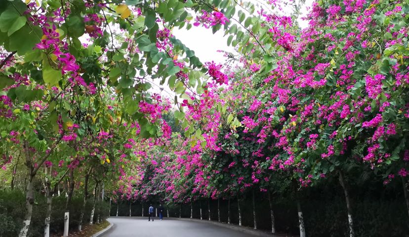 时下,遍布主干道、公园、村庄、河涌边的红花紫荆把番禺装扮得如春天般美丽。在番禺儿童公园的彩虹路,道路两旁繁英满树,红花紫荆把整段路装扮成一条花廊。