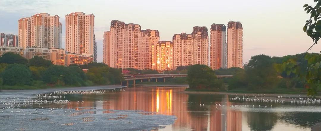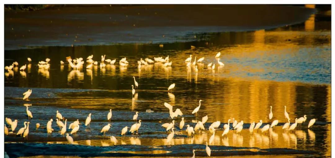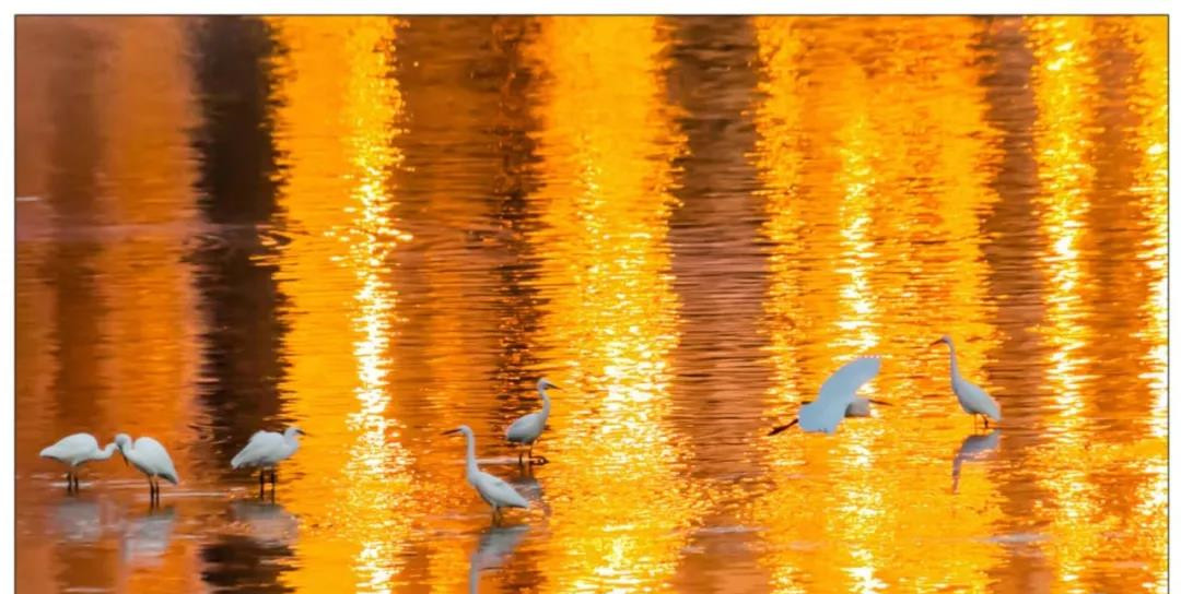 花都湖国家湿地公园沐浴在夕阳中,仿佛披上了一层金色的薄纱,白鹭三三两两结伴信步,宁静而祥和。