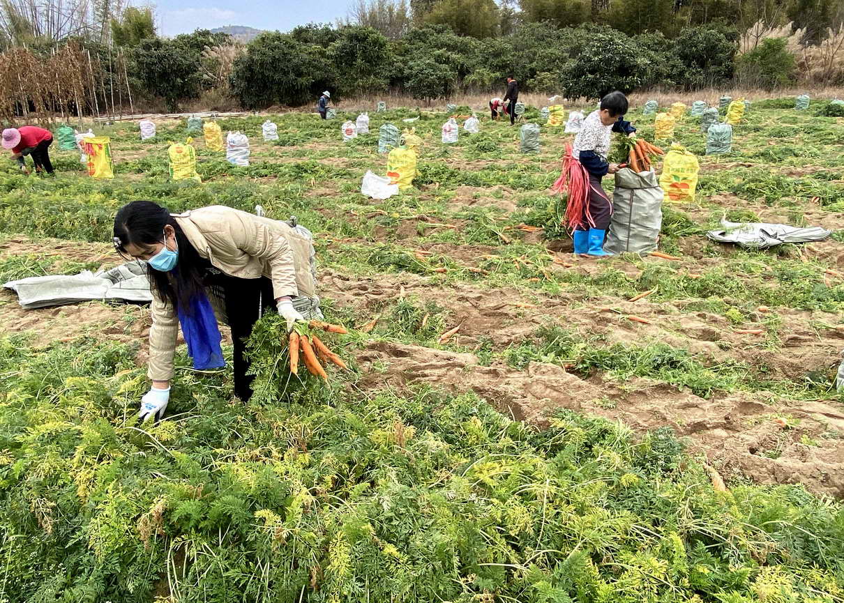 12月22日上午,在韶关曲江白土镇孟洲坝村蓝鹰菜篮子家庭农场红萝卜种植基地里,数十个村民分工明确、各司其职,忙着采收红萝卜。而基地的公路旁,一辆厢式货柜车正在装载已经洗净的“小人参”,待粤港澳大湾区“菜篮子”韶关配送中心检测合格后,便直接配送到大湾区各个菜市场。
