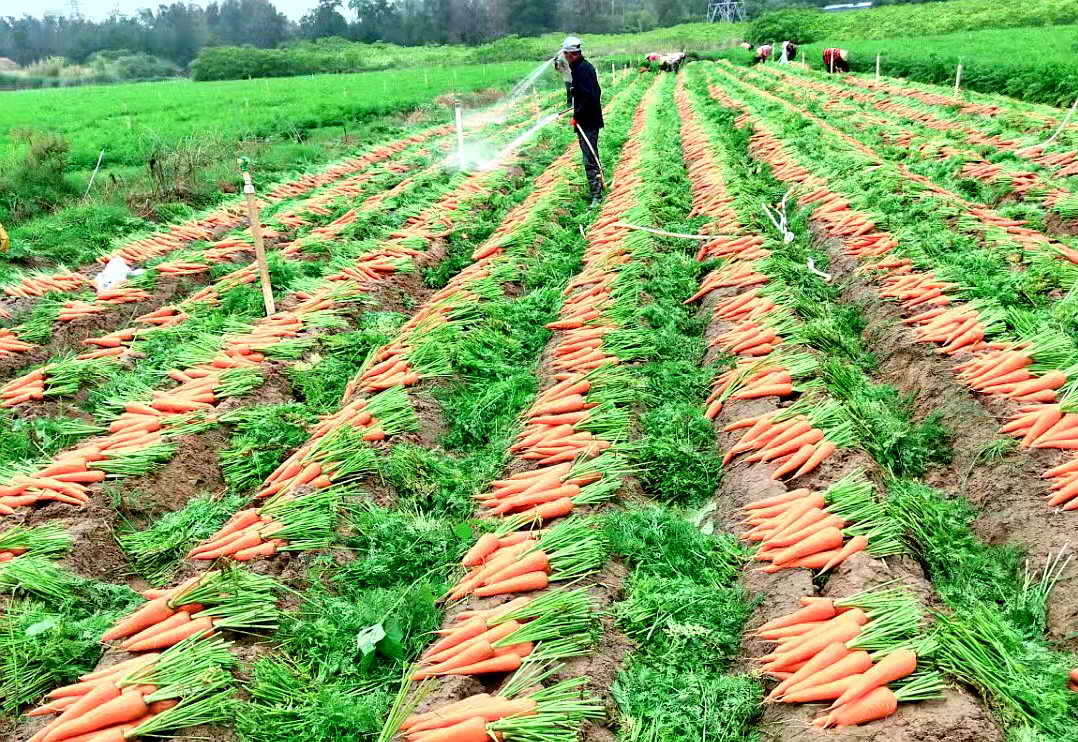 据孟洲坝村蓝鹰菜篮子家庭农场负责人陈兰英介绍,红萝卜的生长期约4个月,目前采收的这批红萝卜已达到成熟标准。记者在现场看到,刚从泥土中拔出的胡萝卜色泽红润,体型匀称,被整齐地码放在田垄上。陈兰英表示,这季红萝卜又大获丰收,她种植了120多亩,亩产近5000公斤,亩产收入可达到3万元。