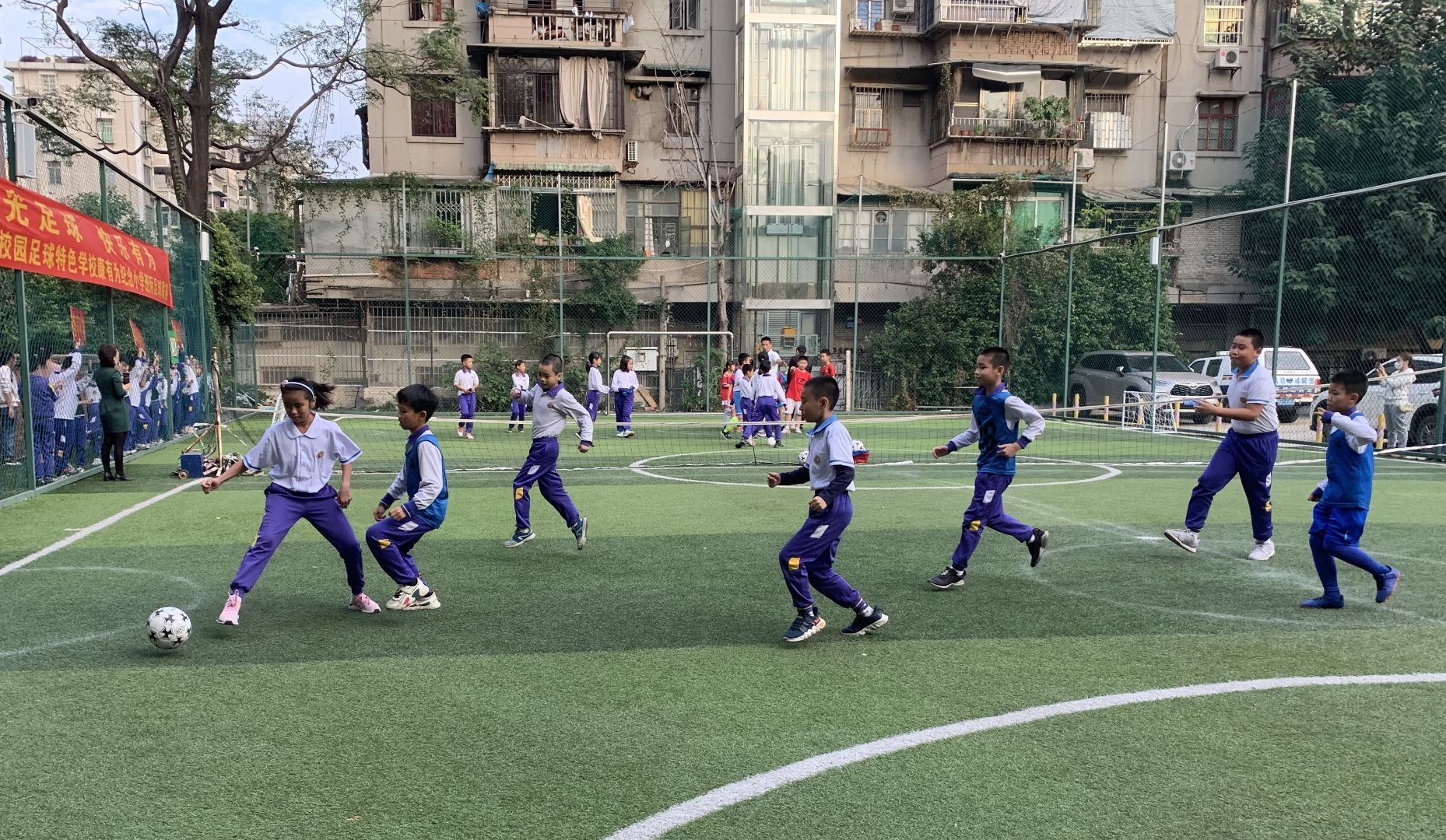发展之初,场地、师资等都成为困扰该校的问题。师资方面,该校体育老师均不是足球专项老师。好在学校很支持,老师们也很愿意学,加上引进第三方机构的教练,足球教学很快步上正轨。2020年,该校还有老师参加了广州市中小学生校园足球教练员培训班。场地方面,该校身处闹市,空间宝贵,但东西校区均各有一块五人制足球场。其中,西校区的球场在2017年完成,东校区的球场在教育部门和街道的帮助下,于2020年完工。实际上,“十三五”期间广州不断加大经费投入力度,累计升级改造2422个学校体育卫生基础设施项目,其中就包括新改扩建足球场地205块。