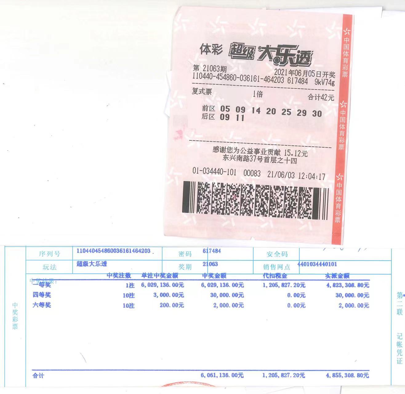 值得一提的是,中出上述大奖的体彩实体店曾于今年6月5日中出21063期大乐透1注基本投注一等奖和若干固定奖,单票总奖金606万,中奖的是一张42元的7+2复式票。这间幸运的体彩店成功缔造了“一年抱俩”的佳话。