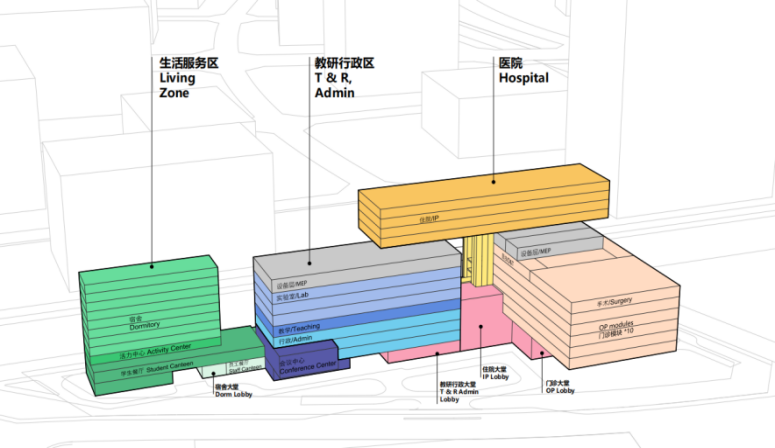 在布局方面,中山大学附属(南沙)口腔医院设计因地制宜,建筑体块采用L型布局,形成医院、教研行政区、生活服务区三大主要功能体块,公众医疗区设置于基地东侧,方便公众进出;生活服务区位于相对安静的西侧;科学教研区及行政办公则位于中部,与两侧功能区紧密联系。同时,空中连桥成为教研、医疗区域便捷、及时互通的关键“纽带”。