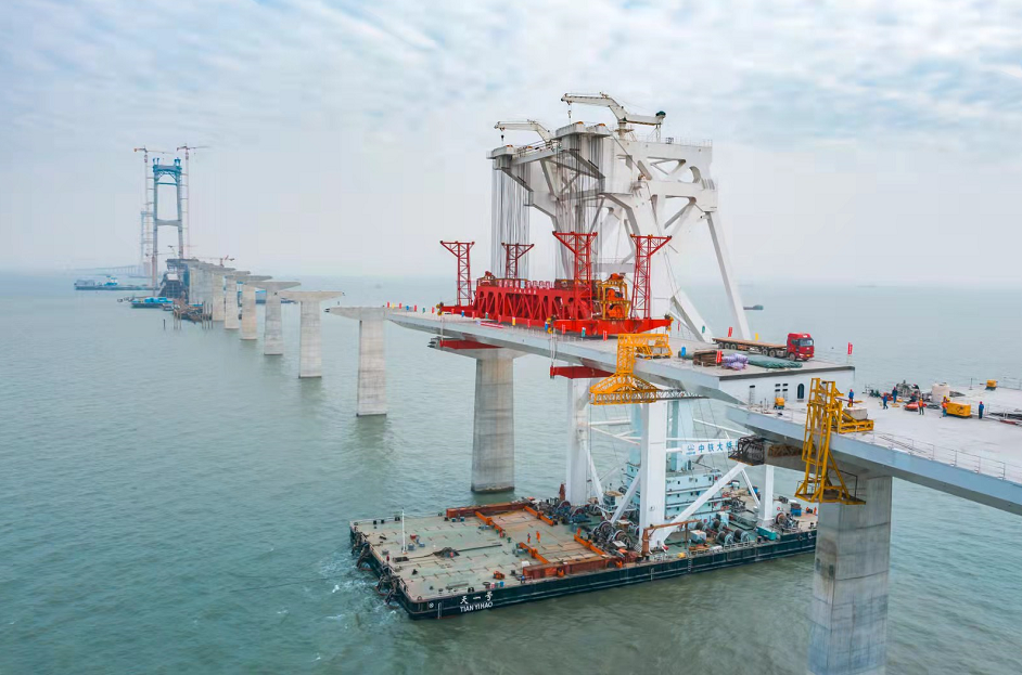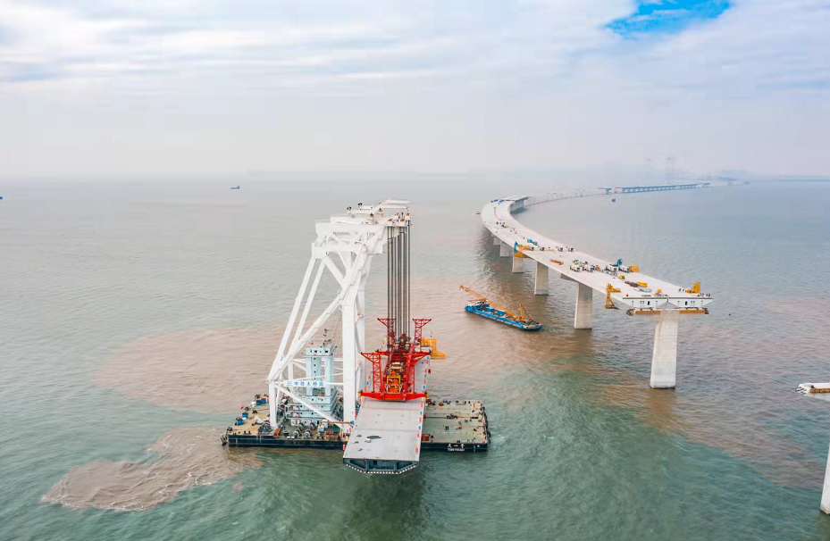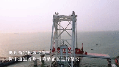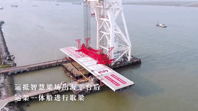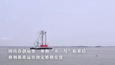 到达出海平台后,再由“天一号”运架一体船起吊钢箱梁、运输至桥位、架设安装。