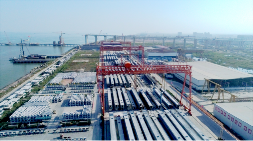 整个梁场共划分为混凝土输送中心、钢筋加工中心、钢筋绑扎中心、箱梁制梁、箱梁存梁区、出海栈桥、试验室及预应力超市等10个主要功能区域。