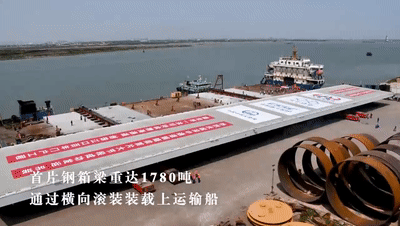 在码头上,建设者将钢箱梁横放于集控组合模块车上,采用横向滚装方式装载上运输船。整个装船过程,高效流畅,精准落位,这是国内梁体结构体量最大的滚装上船。