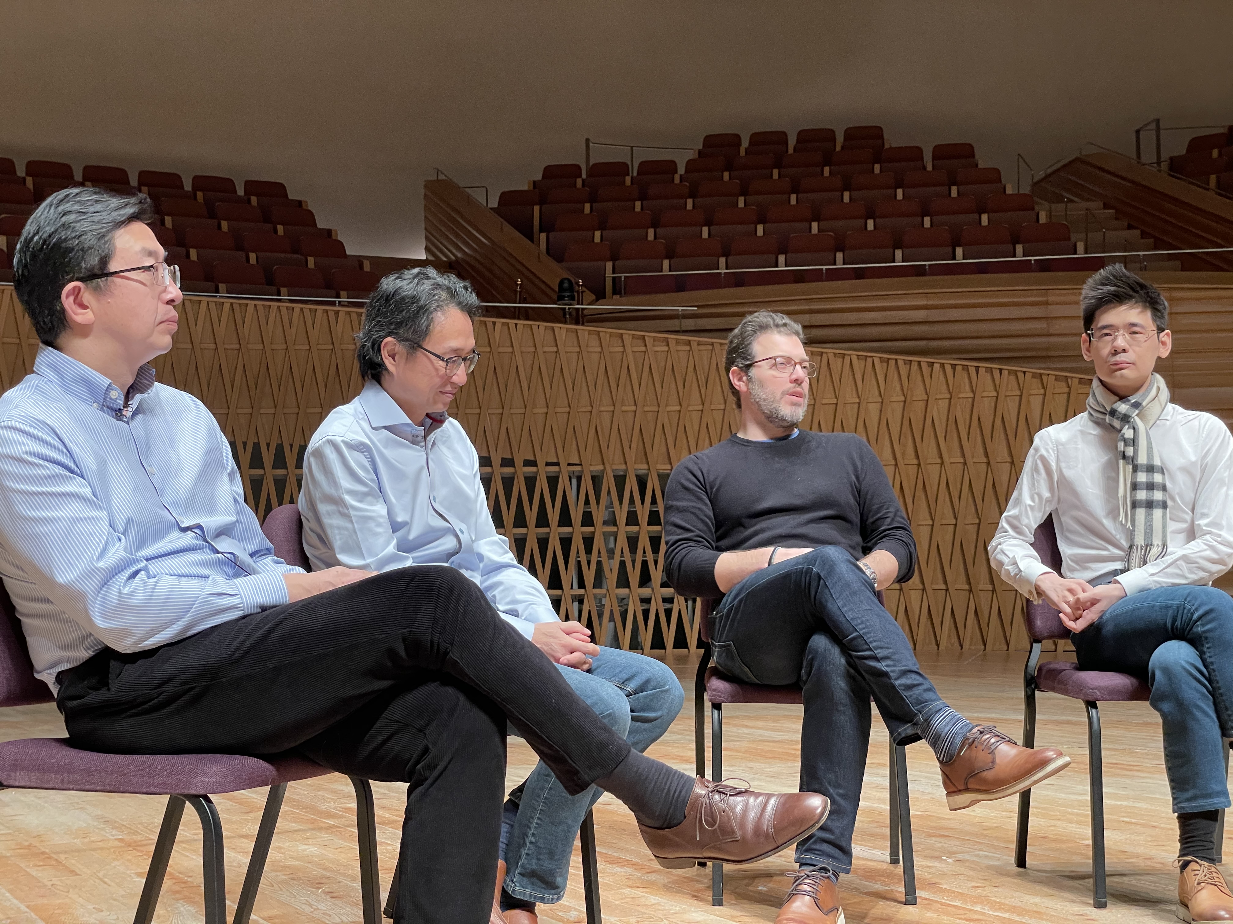 彩排现场(从左至右:第一小提琴李伟纲、第二小提琴于翔、大提琴尼古拉斯·萨瓦拉斯、中提琴李宏刚)演出前,第一小提琴李伟纲、第二小提琴于翔、中提琴李宏刚、大提琴尼古拉斯·萨瓦拉斯四位演奏家在捷豹上海交响音乐厅接受媒体采访,畅聊与上海交响乐团的渊源,合作感受以及对国内室内乐发展的愿景。