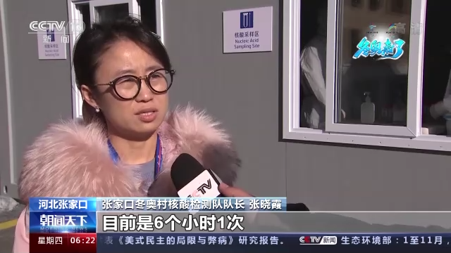 张家口冬奥村核酸检测队队长 张晓霞:目前是6个小时1次,运动员到了6个小时就要来这儿采,普通的运动员都是采用咽拭子采集。