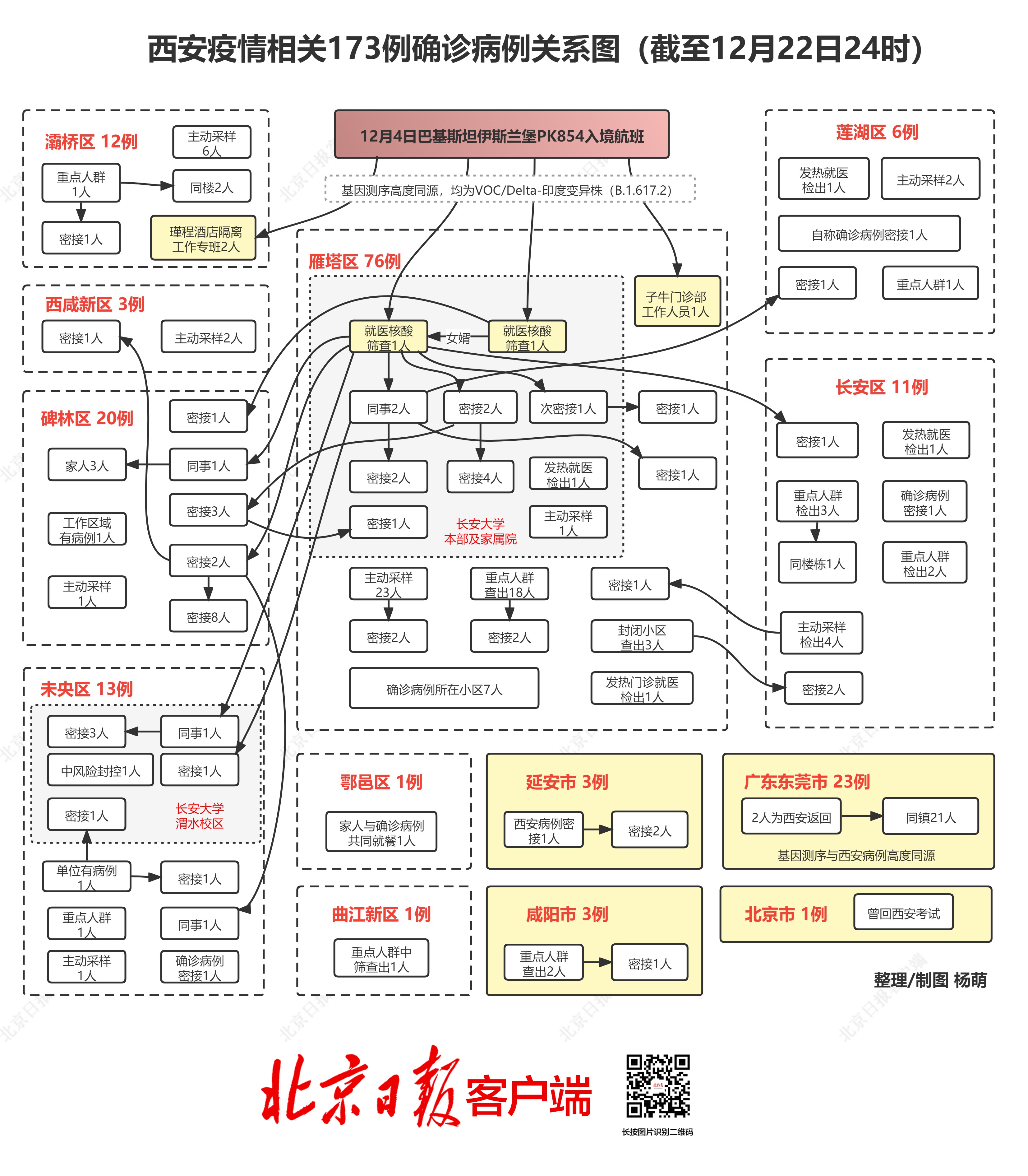 截至12月22日24时,西安本轮疫情已累计报告确诊病例143例,并且外溢到延安、咸阳、广东东莞和北京四地。