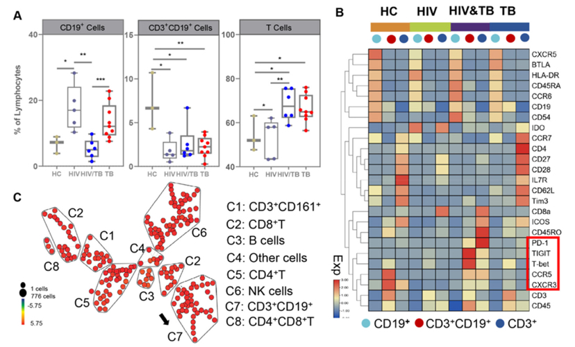 该研究是第一个使用高维流式细胞术综合性的描绘来自 HIV 感染者、Mtb 感染者和 HIV-Mtb 共感染者的淋巴分型及功能谱,并在上述感染性疾病患者中发现一种新的免疫细胞亚群(CD3+CD19+ 细胞),该团队通过更精细的分析展示了各个功能指标包括趋化因子受体、免疫检查点受体、活化分子等在该细胞亚群中的表达差异。上述发现可能有助于提高对该群细胞在感染性疾病中的免疫致病机理的认识,尤其是在HIV-Mtb 合并感染中,该探索可能有助于科研开发HIV、Mtb及HIV-Mtb 合并感染的靶向治疗药物或新策略。