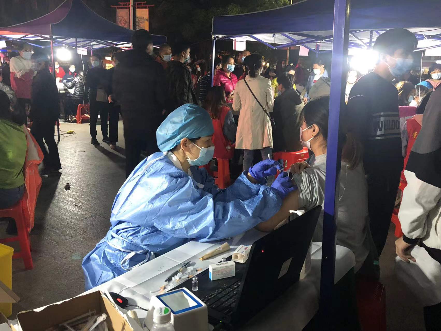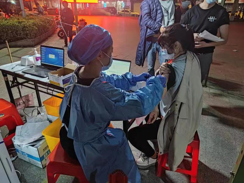 接近天色暗下来的时候,江高镇卫生院马上安排后勤科人员加装照明灯。为方便附近群众,多个临时接种点的服务时间延长至晚上。现场可见晚上9点还有不少群众排队,大部分医务人员和其他工作人员都从早上一直没有间断地忙到晚上。“阿姨,先拿这个知情同意书,这边是登记了,登记完再过去那边打疫苗。”大家都耐心高效地继续服务群众。