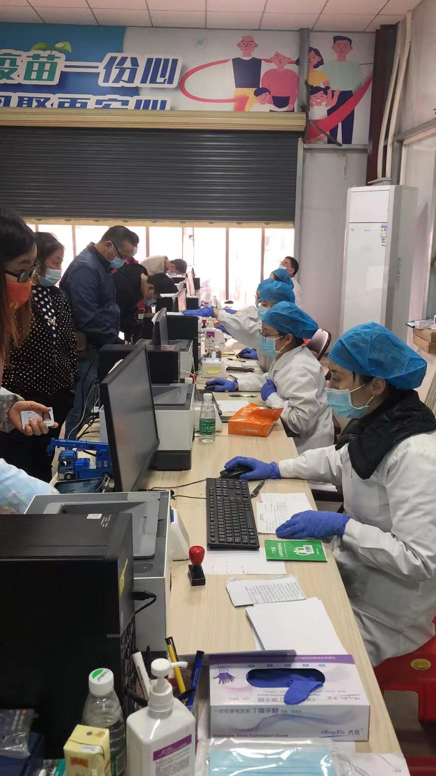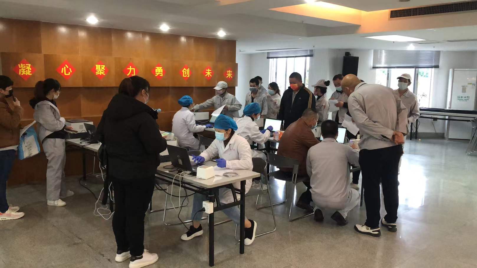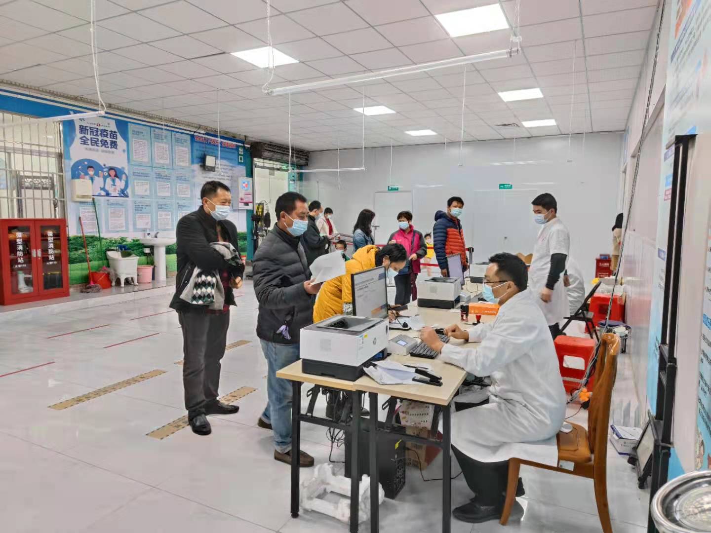 江高镇卫生院于前一天下午迅速安排信息科提前准备电脑、打印机、身份证读卡机等设备,连夜到厂区安装调试,医务科、护理部、公卫科等协调安排好熟练的登记和接种人员,并准备所需物资,后勤科及时调度车辆,为前线提供坚强的保障。经过有序安排,员工分批进行接种,两天时间共为维高集团、广东艾圣公司白云清洁集团共2100多名员工冠疫苗接种。