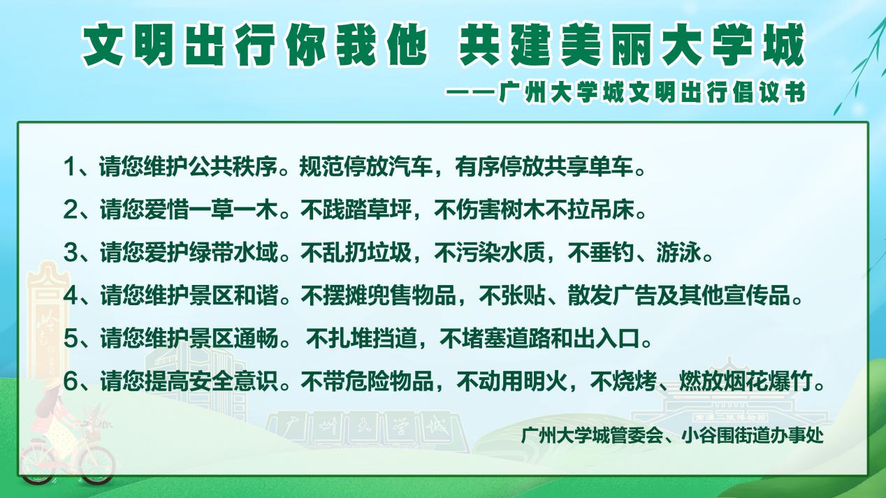 广州大学城再次发出倡议:请广大市民朋友出游规范停放车辆,不乱扔垃圾、践踏草地,请勿明火烧烤、拉挂吊床、乱摆乱卖。