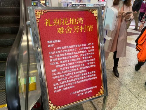 信息时报讯(记者 王智汛 梁启明)继王府井百货东山店、摩登百货海购店发出撤场公告后,又一家陪伴老广多年的百货店传出结业消息。12月24日,广州东百花地湾百货有限公司发出通告,称因为租赁合同到期,百货将于2022年1月9日闭店。