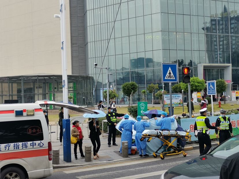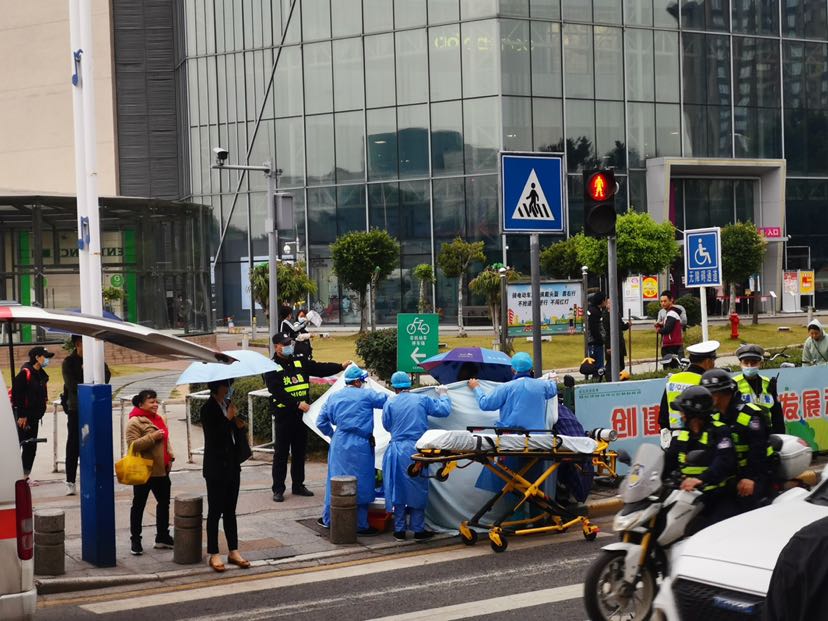 当时正在一旁值班的民警发现该情况后,立即在现场维护起了秩序。不一会儿,一辆红灯闪烁的救护车出现在附近。
