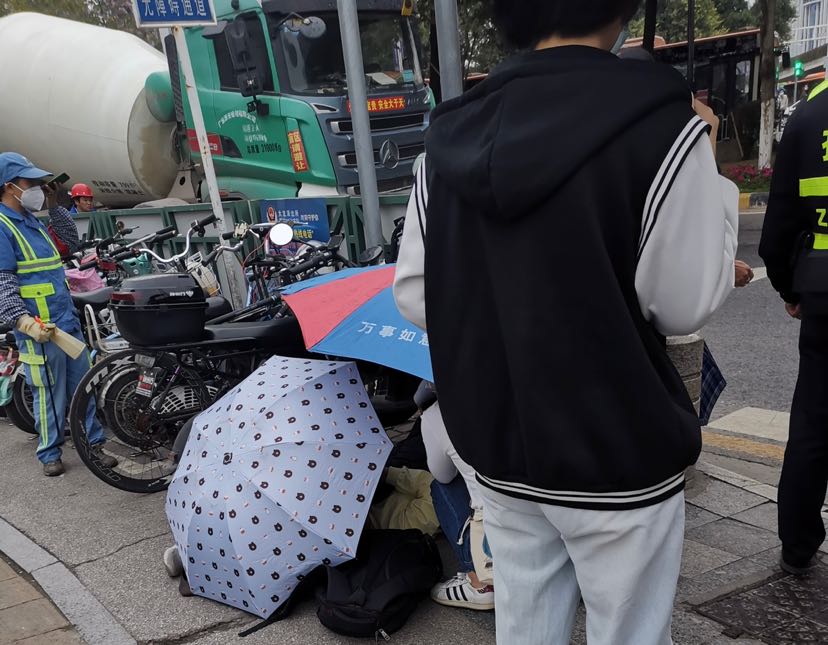 上午9时10分左右,正值上班高峰期,记者在现场发现,一名孕妇在番禺大道南辅路永旺梦乐城门口等待红绿灯时,突然捂住肚子说:“我肚子疼,要生了!”路过的几位热心市民听到后,立即上前扶住孕妇,并让孕妇先躺在地上。当时飘着细雨,天气比较寒冷,有市民拿出自己的雨伞,给孕妇简单制作了一个“小帐篷”;有市民担心她着凉给孕妇披上自己的衣服;还有的市民则将自己的书包给孕妇垫着头。