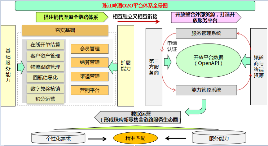 当前,珠江啤酒把握O2O模式核心点,已完成渠道业务互联网化、会员运营、数字兑奖应用三大板块功能上线,建立起新零售业务中台,并整合ERP、OA、WMS等信息系统,协同一物一码、公众号、第三方电商、供应链系统等,构建起企业级的互联网架构平台。其中订单管理系统主要是解决销售业务互联网化,通过对订单、结算、物流、费用计算等业务的在线化,建立厂商之间高效运作的桥梁,提升运作效率。
