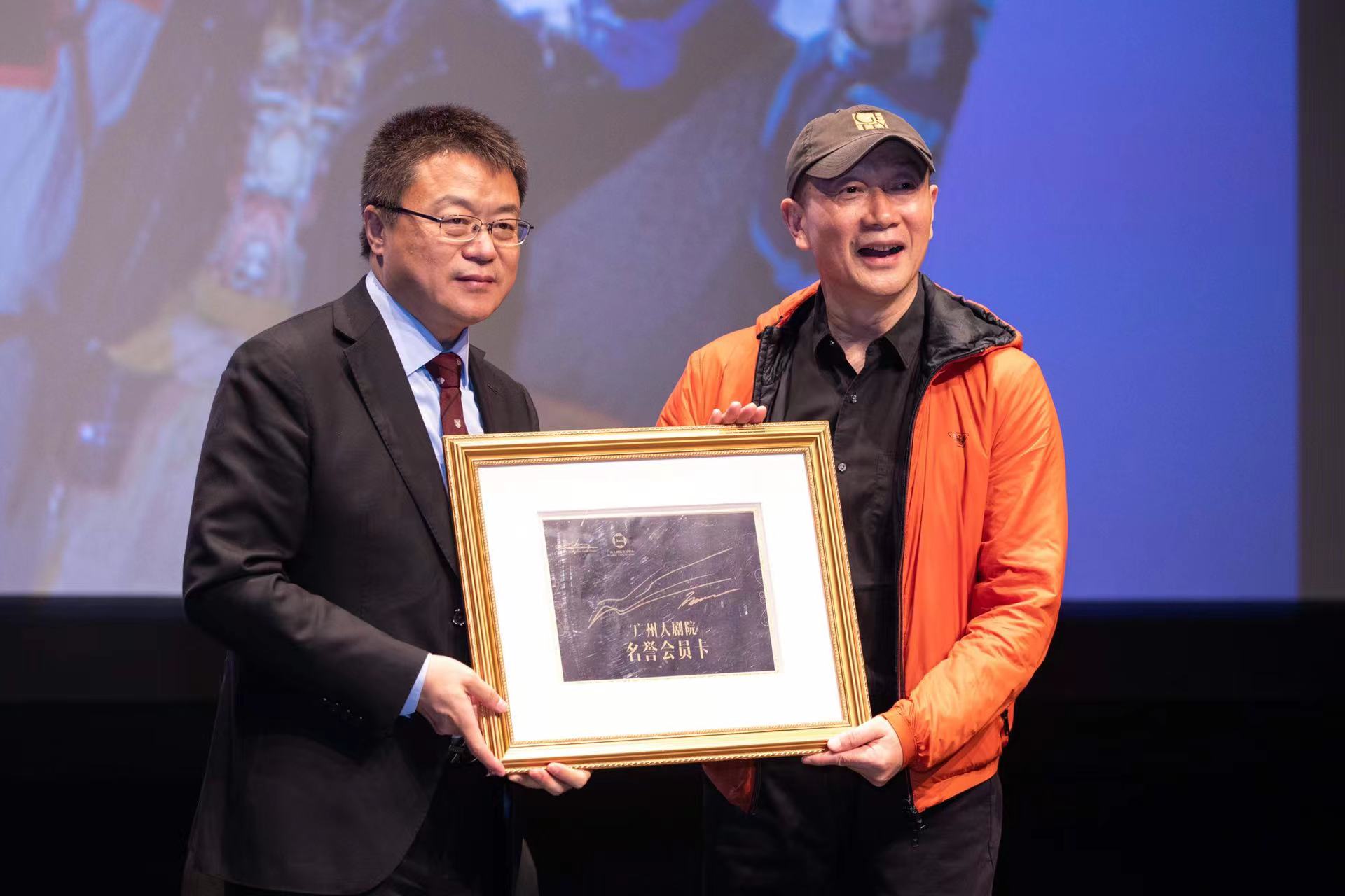 广州大剧院总经理何鹰向谭盾送出“名誉会员卡”